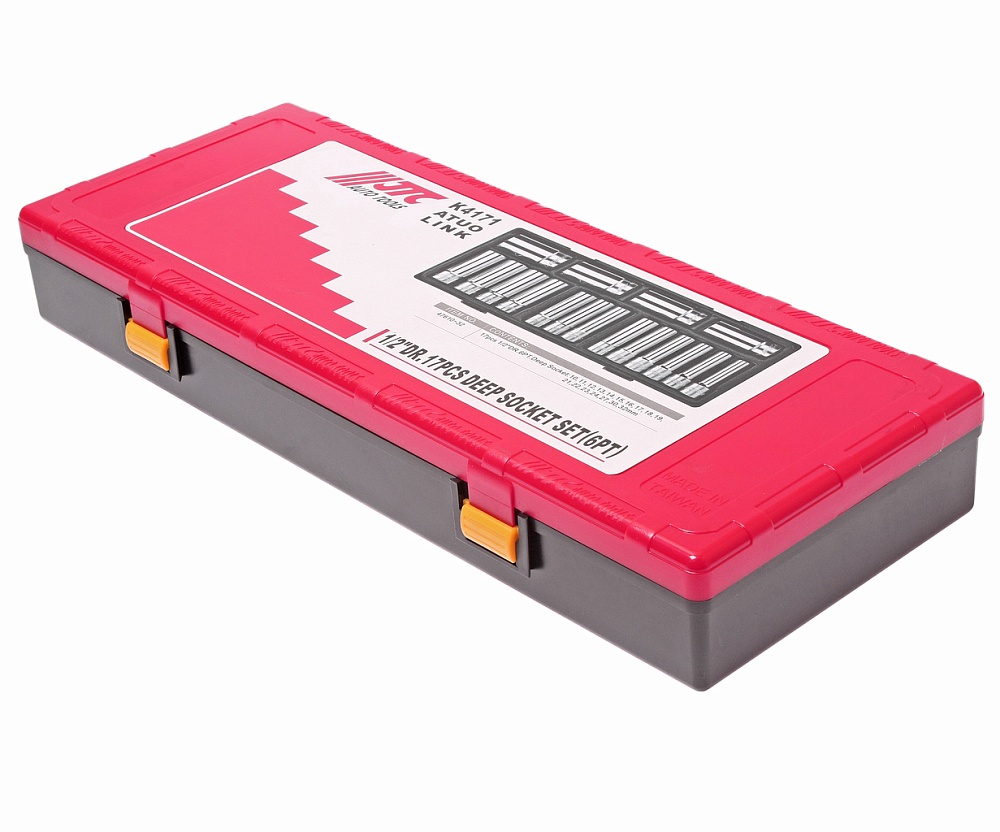 Артикулы JTC-47610-32: головки глубокие 6-гранные, 1/2': 10, 11, 12, 13, 14, 15, 16, 17, 18, 19, 21, 22, 23, 24, 27, 30, 32 мм. - 17 шт.