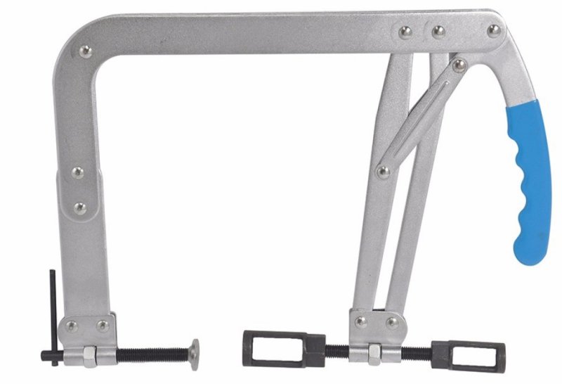 Предназначен для сжатия пружин впускных и выпускных клапанов. Особенности: Выполнен в форме струбцины. Используется при снятой головке блока цилиндров. Регулировка рабочего хода с помощью резьбового вала в зависимости от длины клапана. Фиксация струбцины в необходимом положении позволяет освободить руки для удобства демонтажа стопорных сухарей клапана. Рабочий диапазон: 35-142 мм
