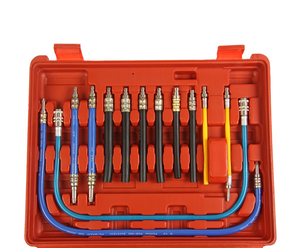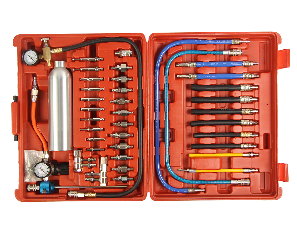 Стенд для промывки форсунок. Комплект предназначен для очистки топливной системы инжекторов без демонтажа форсунок. Данный набор также очищает и детали цилиндро-поршневой группы, из-за того, что принцип работы данного устройства основан на подаче чистящего вещества в цилиндры двигателя вместо обычного топлива. Для очистки используют специальную промывочную жидкость типа Лавр или Wynns.