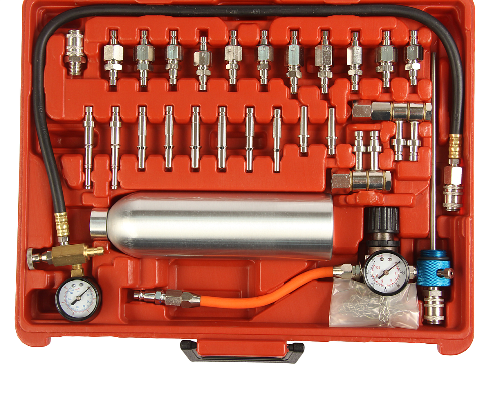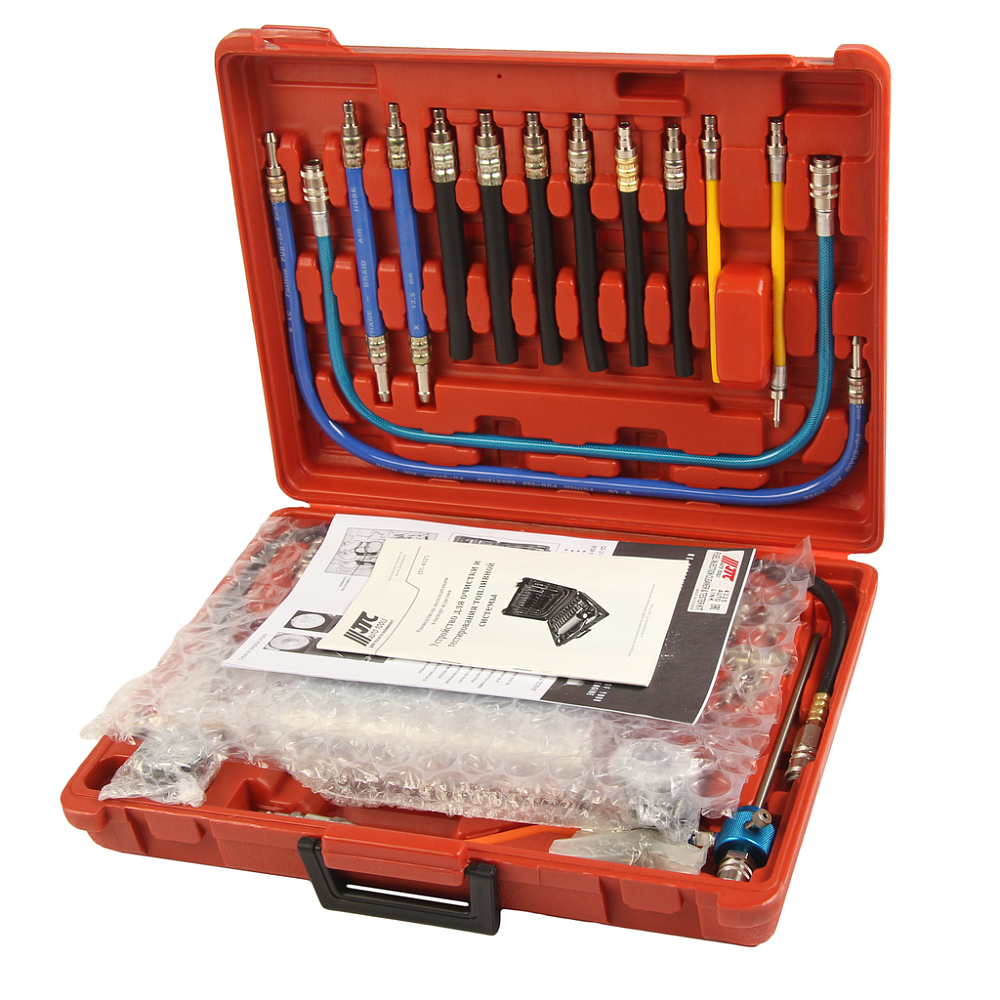 Каждый компонент устройства для тестирования и чистки топливных систем JTC 4325 надежно зафиксирован в индивидуальной ячейке прочного переносного кейса, что гарантирует сохранность комплекта во время транспортировки.