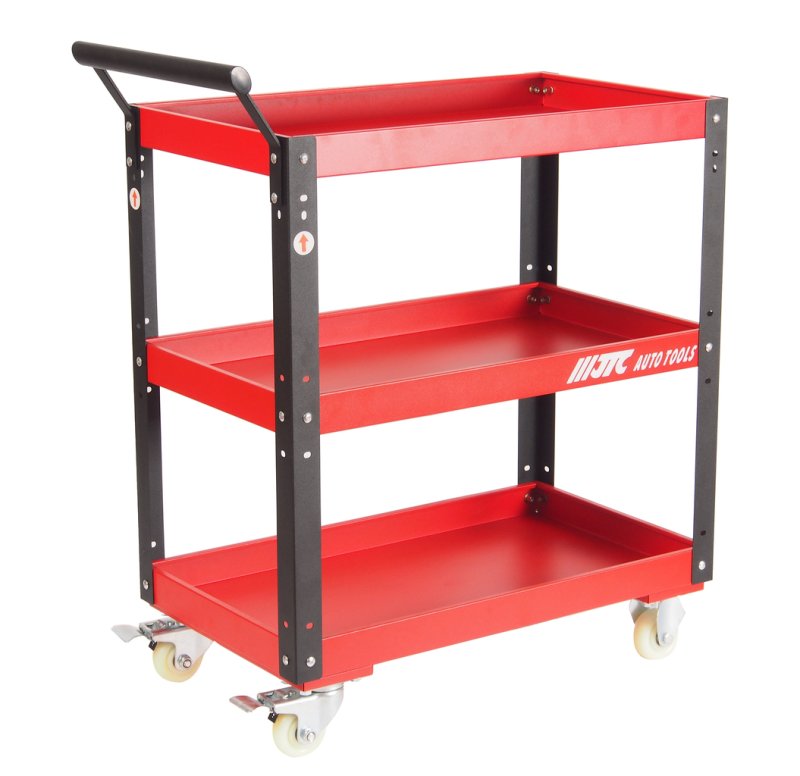 Инструментальная тележка (3 секции, на колесах, с открытым отсеком, красная) JTC-S1053 располагается на 4-х колесах с тормозом. В верхней части располагается удобная рукоятка. Трех полок достаточно для транспортировки ручного и электроинструмента, а также крепежа.