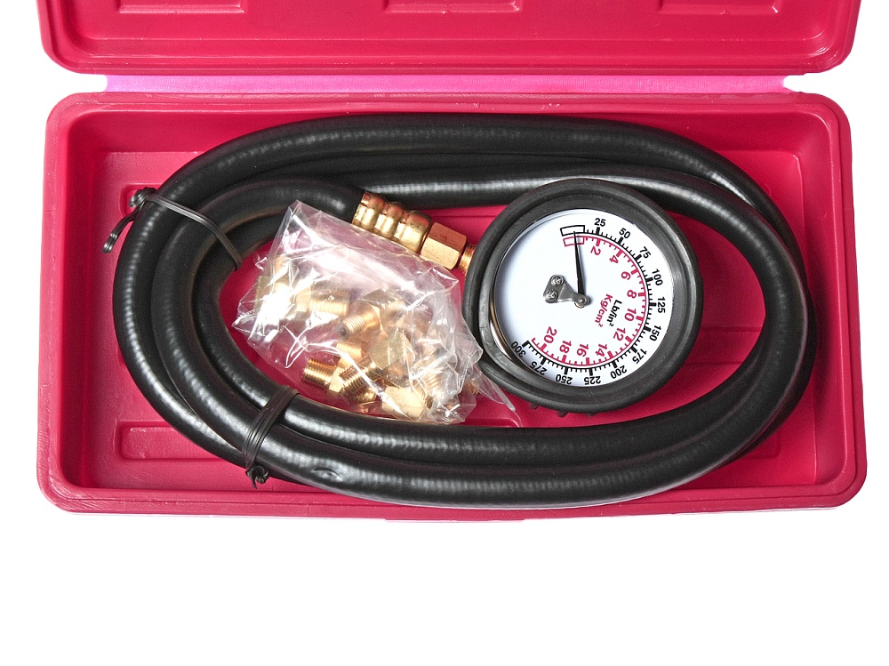 Тестер давления масла в двигателе предназначен для проведения работ по диагностике давления масла в любом типе автомобилей. Оснащён двойной заметной шкалой + шланг 600 мм с резьбой (NPT) 1/8'' + адаптеры 1/4'' NPT + 3/8 NPT. Диапазон измерений: 0-300 psi (0-21 бар). <br>