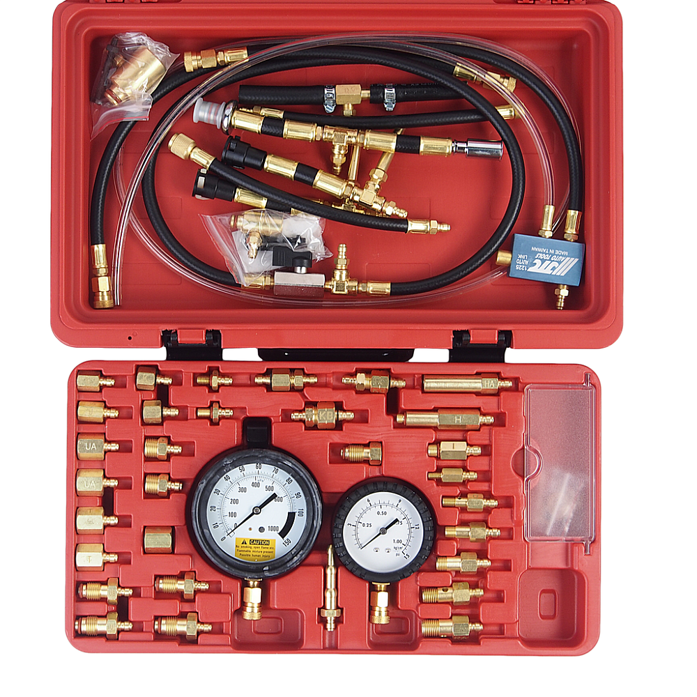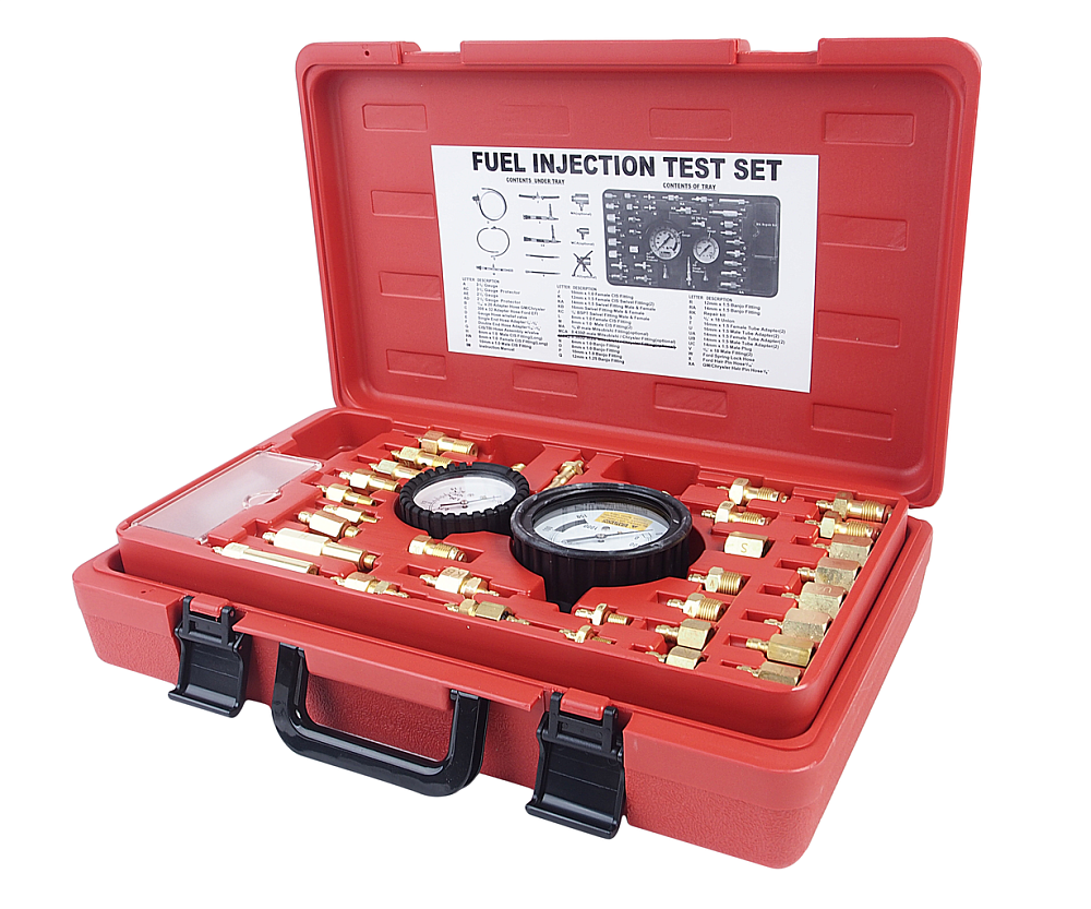 В комплект входят манометр 3-1/2'' со шкалами 0-145 PSI и 0-1000 кПа, манометр низкого давления 2-1/2'' (для давления ниже 15 PSI), адаптеры, шланги и разнообразные разъёмы для оперативной диагностики инжекторов, а также надёжный пластиковый кейс и руководство по эксплуатации.