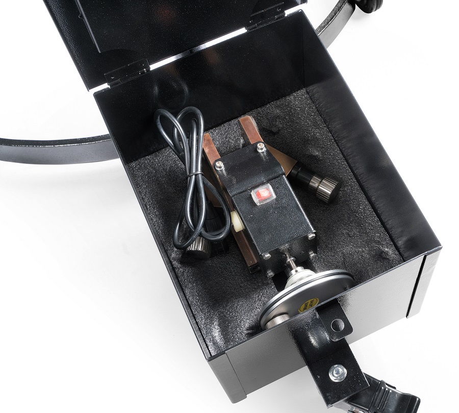 Профессиональный станок для качественного восстановления поверхности тормозных дисков. Простая, и в тоже время надежная конструкция станка позволяет без особых усилий  провести проточку тормозных дисков как установленных на ступице автомобиля, так и снятых. Высокая точность обработки обеспечивается регулировочным устройством подачи резцов с шкалой деления 0,05 мм.  Регулируемя по высоте стойка создает дополнительное удобство при проведении работ.