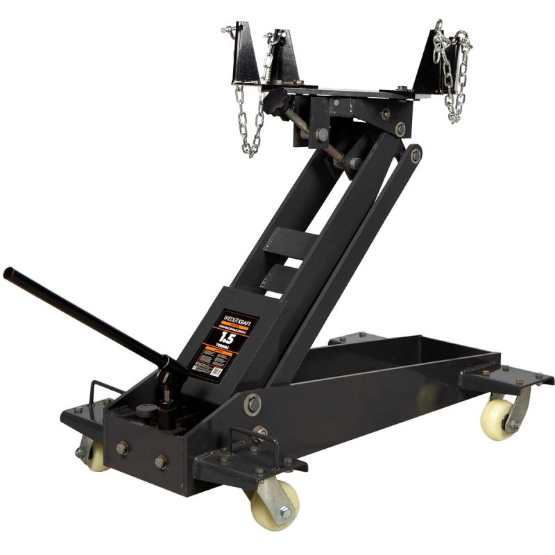 Регулируемая площадка оснащена захватами и цепями. Изделие снабжено 4 колесами для подката под кузов транспортного средства. Трансмиссионный домкрат способен удерживать до 1,5 тонны.