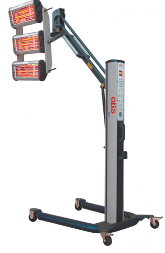 Стойка с пневмоцилиндром, две кассеты с тремя  рядами горизонтально расположенных ламп;  электронное программирование времени и мощности предварительной и основной сушки; возможность изменения площади, а также скорости сушки за счёт изменения угла наклона каждого ряда ламп, датчик расстояния. Мощность 6 ламп х 1000 Вт., 230 В. Площадь нагрева 1800мм х1000мм