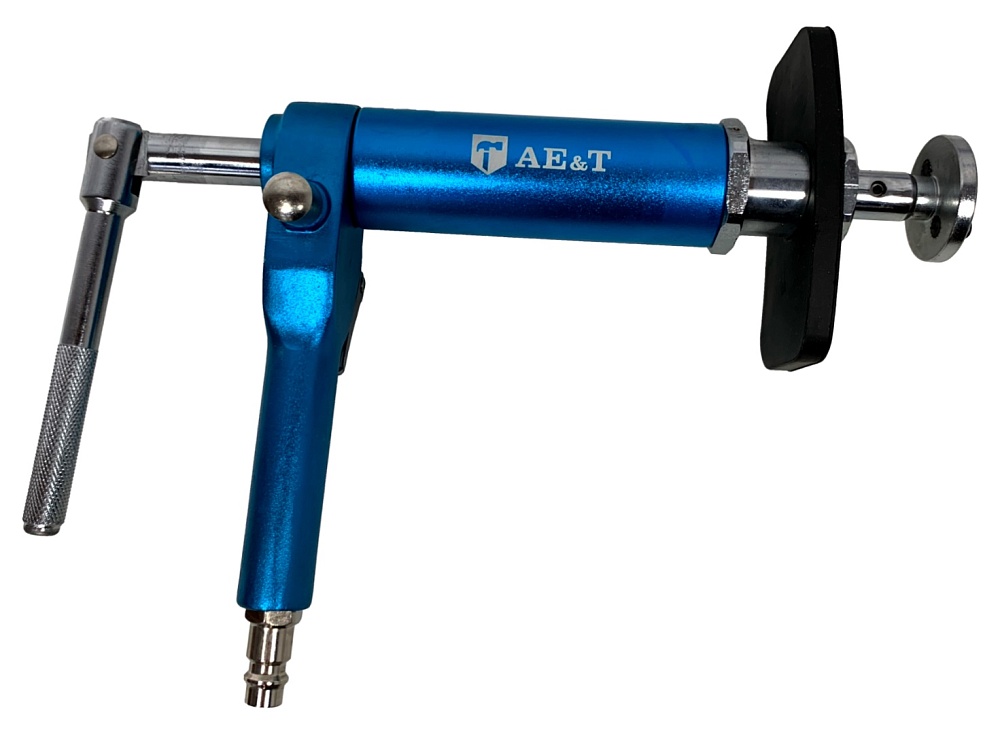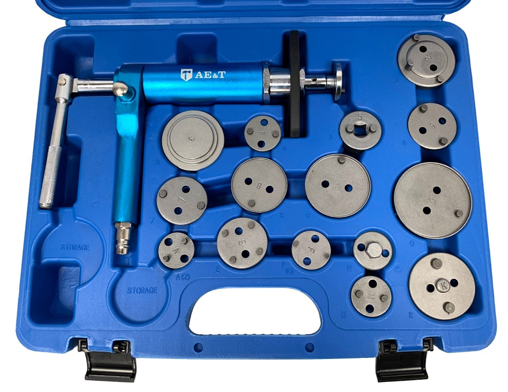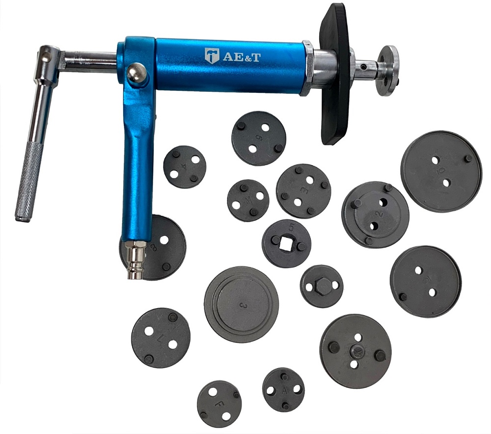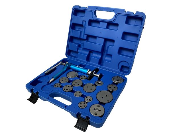 Набор для возврата тормозных поршней, исключающий риск повреждения поршней или резиновых манжет. Набор содержит основной инструмент с пневмоцилиндром для выталкивания шеек поршней. В комплект входят 15 адаптеров. Пригоден для суппортов как с левой, так и с правой резьбой.