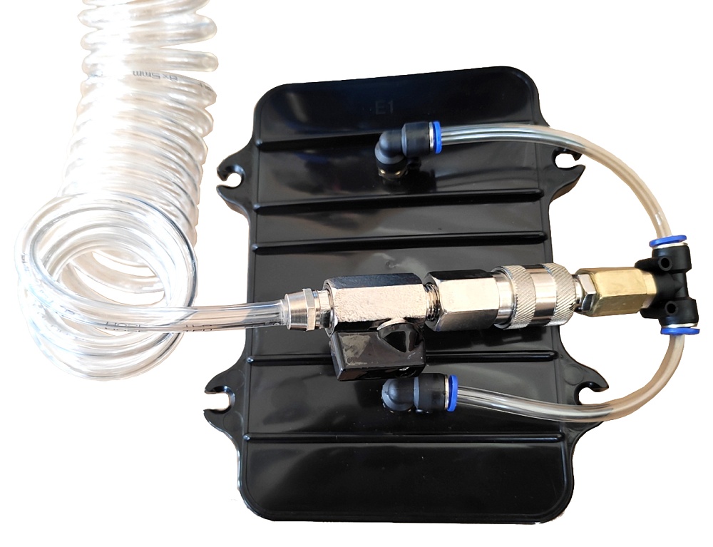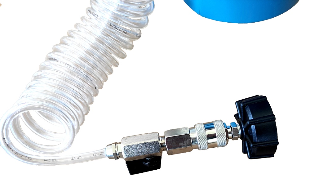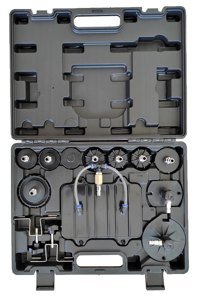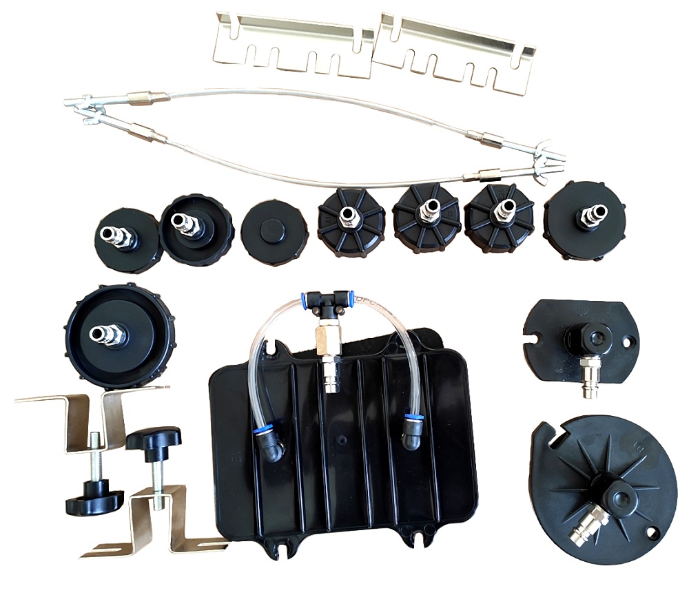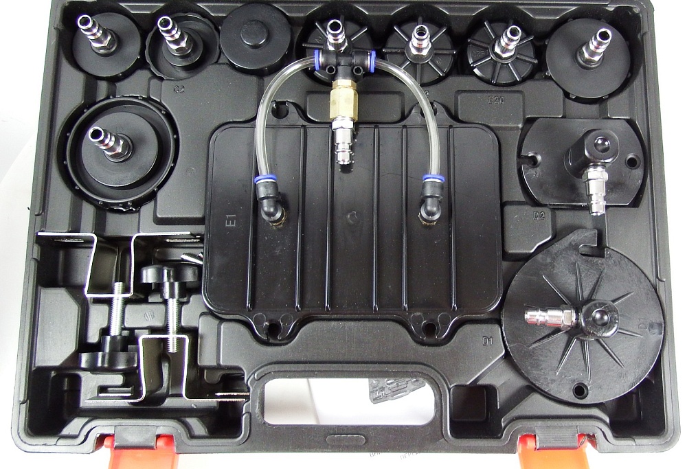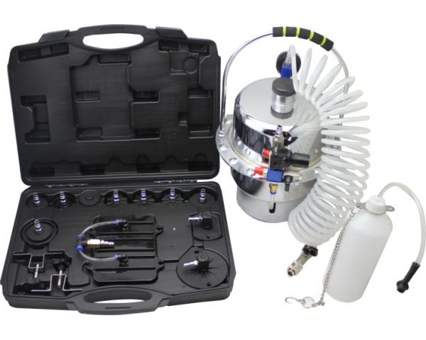 Набор укомплектован адаптерами для автомобилей и бутылями для сбора жидкости.