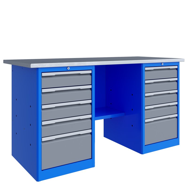 Верстак серии Technic 161.55.1 состоит из столешницы шириной 1596 мм, двух тумб P5 с четырьмя малыми и одним большим ящиком и полки-стенки.