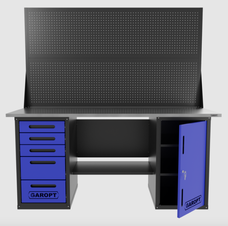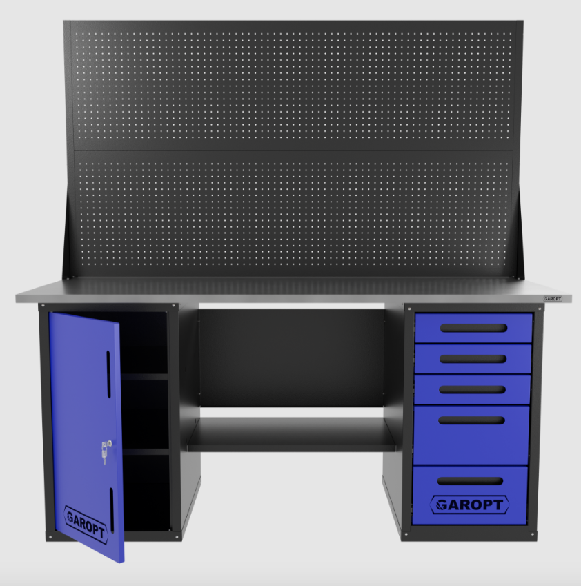Верстак двухтумбовый дверь/5 ящиков с двумя экранами, синий 1800*700 Garopt, GT1800DY5PP2.blue купить в Краснодаре цена ✅ - Все для СТО