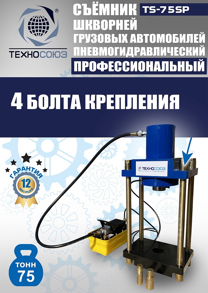 Профессиональный съемник шкворней TS-75SP для грузовиков (MAN, Mercedes, Scania, Volvo, КамАЗ, корейские/китайские), тракторов, погрузчиков, спецтехники — усилие 75 тонн, пневмогидравлика, ход поршня 160 мм, диаметр шкворня до 60 мм. Рабочее окно 400×320 мм, расстояние шпилек 320 мм. Мобильный с колесами.